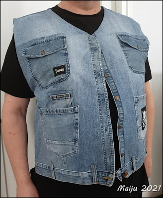 Sain kesällä sukulaismiehiltä kasan farkkuja tuunausmateriaaliksi. Ajattelin sitten, että teenkin niistä mm. jotain heille. Vanhemmalla hepulle monitaskuinen liivi, jollaisia muutenkin käyttää. Kuvassa mieheni joutui toimimaan "mannekiinina". Nyt vaan toivon, ettei liivi ole kohteelle liian iso.... se jää nähtäväksi. Etuosan läppätaskut on farkkupaidasta, samoin tuo napituskaistale. Alareuna on kaksien farkkujen vyötäröista koottu. Sisäpuolella kaksi povitaskua, toinen vetoketjullinen, toinen kaksiosainen - voi pitää vaikka kynää toisessa puolessa. Ala- ja takataskut on farkkujen takataskuja ja pikkutasku. Sisäpuolella vielä yllärinä ja hullutuksena omasta roskiin heitettävästä paidastani kiroileva siili :) Joulupakettin menee tämä tekele, taskuun laitoin vielä suklaapatukan.